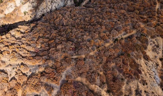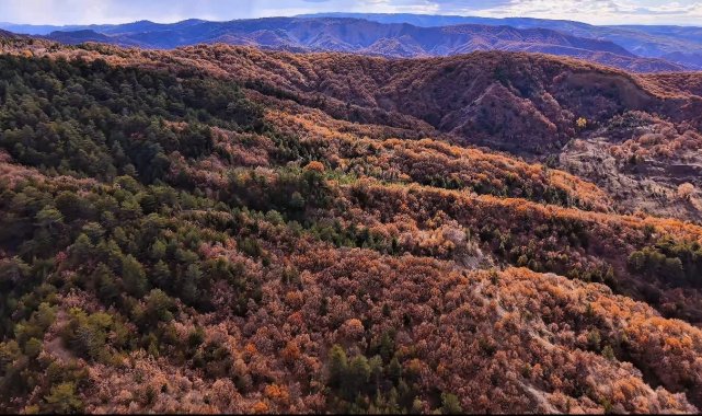 Çankırı'nın Yapraklı ilçesinde sonbaharla birlikte renk cümbüşünün başladığı ormanlar havadan görüntülendi.