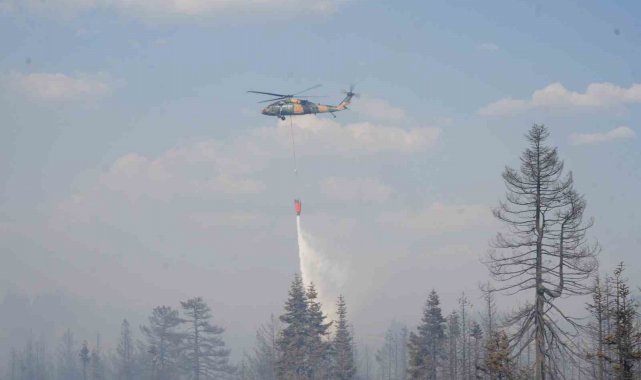 Çankırı'nın Yapraklı ilçesinde çıkan orman yangınına 7 helikopterle havadan, çok sayıda ekiple de karadan müdahale edilirken, köylüler de traktörlerine bağlı tankerlerle söndürme çalışmalarına destek verdi.