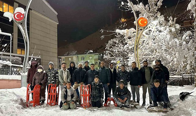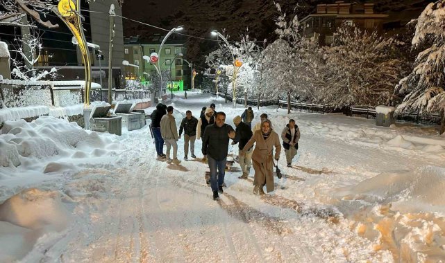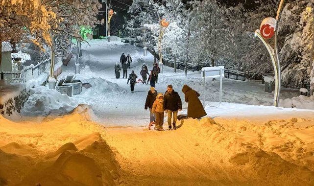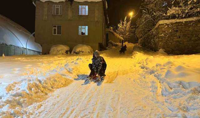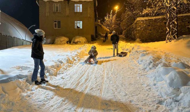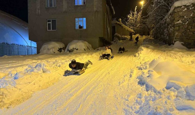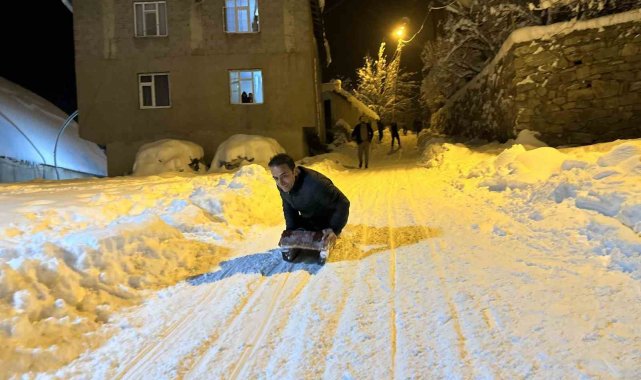 Van'ın Çatak ilçesinde etkili olan yoğun kar yağışı nedeniyle okulların il genelinde tatil edilmesini fırsata çeviren öğrenciler, kızaklarıyla gece geç saatlere kadar kayarak karın keyfini çıkardı.