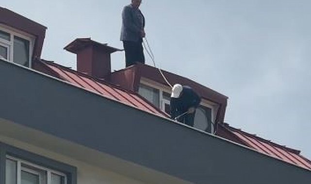 Çatı tadilatı yapan işçi beline ip bağlayarak güvenlik önlemi aldı