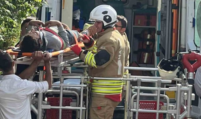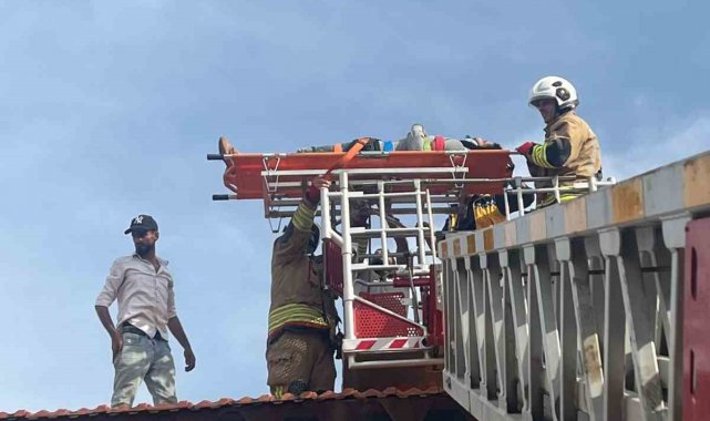 Hatay'da çatıda çalışırken üzerine su deposu devrilerek yaralanan işçi, itfaiye merdiveniyle indirilip sağlık ekiplerine teslim edildi.