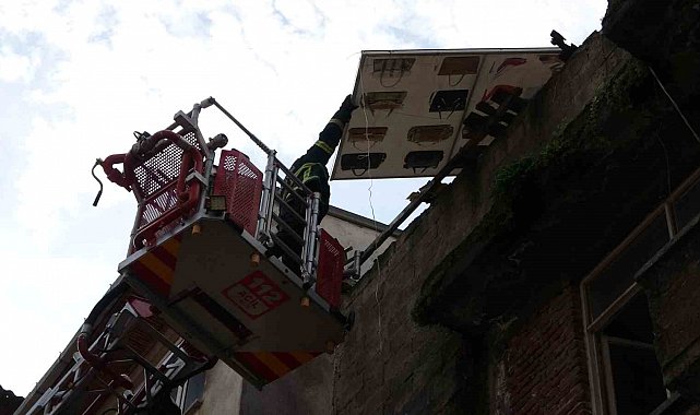 Ekipler, merdivenli itfaiye aracıyla yukarıya çıkarak, düşme tehlikesi olan panoyu kaldırdı.