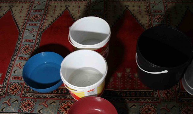 Adana'da 201 yıllık camide, sağanak yağışın ardından tavandan su akarken imam, akıntının olduğu noktalara kovalar yerleştirerek önlem almaya çalıştı.