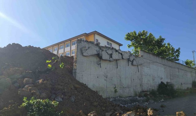 Samsun'da yoğun yağışların ardından çatlaklar oluşan bir lisenin bahçe duvarı, yıkılma riski taşıdığı için kontrollü şekilde yıkıldı.