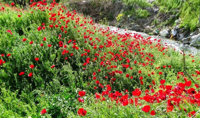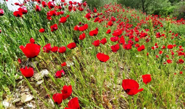 Kütahya'nın Hisarcık ilçesinde çay kenarını çiçek bahçesine dönüştüren gelincikler görsel güzelliği ile dikkat çekerken, tablo gibi manzara ortaya çıkardı.