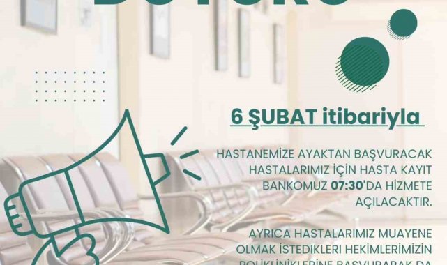 Çarşamba Devlet Hastanesi, hasta kabul sürecini daha verimli hale getirmek amacıyla yeni bir düzenlemeye gitti. Hastaneye ayaktan başvuracak hastalar için hasta kayıt bankosu, 07.30 itibarıyla hizmet vermeye başlayacak. Böylece erken saatlerde muayene olmak isteyen vatandaşlar, işlemlerini daha hızlı gerçekleştirebilecek.