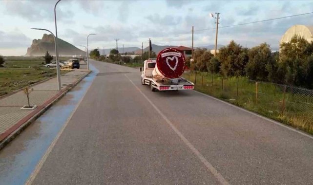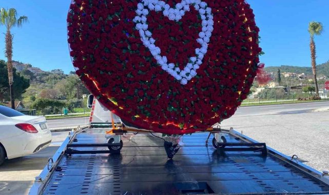 Araç platformu büyüklüğünde hazırlanan aranjman, özellikle ilçe merkezindeki ana arterlerde dikkat çekti. Kırmızı güllerle kaplanan yuvarlak tasarımın ortasında yer alan beyaz kalp figürlü dev arajmanı görenler cep telefonlarına sarıldı. Genç çiftler ve aileler dev kalbin önünde hatıra fotoğrafları çektirirken, sosyal medyada paylaşılan görüntüler kısa sürede yayıldı. Çekicinin Gazipaşa caddelerindeki görüntüsü dronla da kayıt altına alındı.