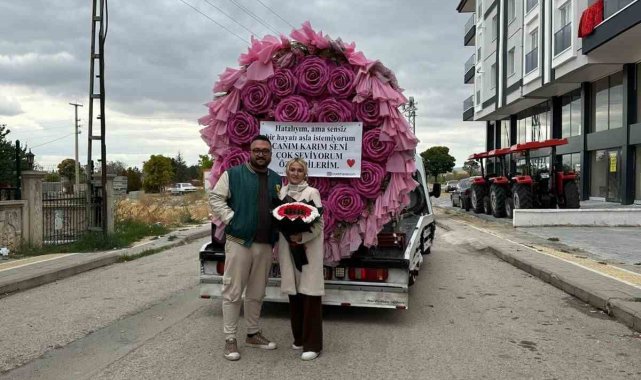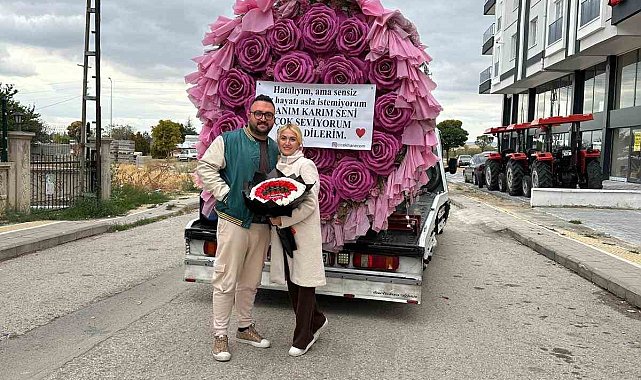 Ankara'nın Akyurt ilçesinde bir vatandaş, eşinden özür dilemek için çekiciyle dev bir çiçek gönderdi.
