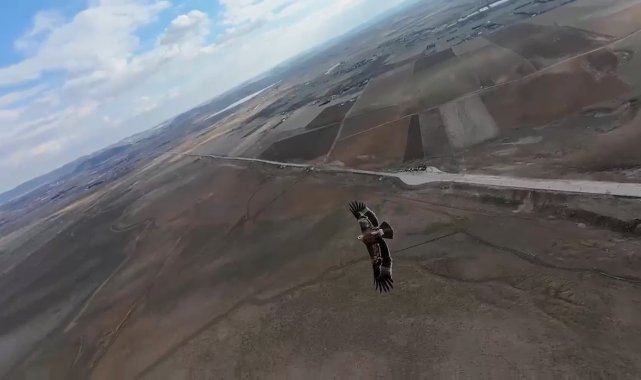Bursa'da arazide çekim yapan dron, o sırada havada olan şahinin radarına takıldı. Meraklı şahin, uzun süre dronun etrafında döndü. O anlar dron kamerasına yansıdı.