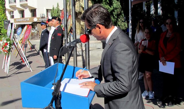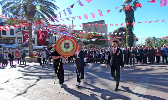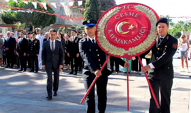Cumhuriyet Meydanı'nda düzenlenen törene; Çeşme Kaymakamı Mehmet Maraşlı, Garnizon Komutanı İstihkâm Albay Erol Dağdeviren, Belediye Başkanı Lâl Denizli, Cumhuriyet Başsavcı Vekili Şahin Şevli, resmi kurum amirleri, siyasi parti ve sivil toplum kuruluşu temsilcileri, mahalle muhtarları, gaziler ve çok sayıda vatandaş katıldı. Sunuculuğunu Deniz Önol'un yaptığı törende; Çeşme Kaymakamlığı, Çeşme Belediyesi, siyasi partiler ve STK'lar Atatürk Anıtı'na çelenk sundu. Ardından saygı duruşunda bulunuldu ve İstiklal Marşı okundu. Kaymakam Maraşlı, Şeref Defteri'ni imzaladı.