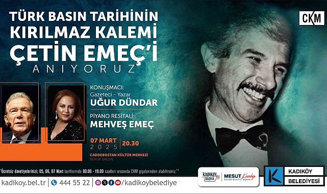 Kadıköy Belediyesi, özgür ve bağımsız gazeteciliğin simgelerinden olan Çetin Emeç'i anma programı düzenliyor. Gazeteci-Yazar Uğur Dündar'ın konuşmacı olacağı anma programında Çetin Emeç'in kızı, ülkemizin önde gelen piyanistlerinden Mehveş Emeç'in piyano resitali olacak.