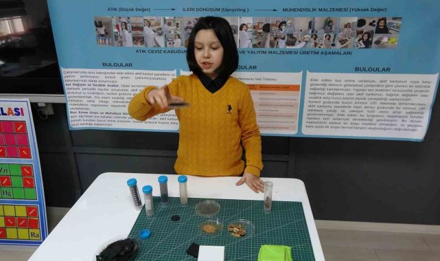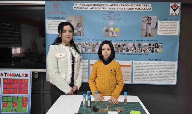 Fatma Temel Turhan Bilim ve Sanat Merkezi'nde 5.sınıf öğrencisi olan Asaf İsmail Çavuş, geliştirdiği proje kapsamında, doğada atık olarak kalan ceviz kabuklarını özel işlemlerden geçirerek yüksek performanslı aktif karbona dönüştürdü. Elde edilen bu çevreci materyal, buzdolaplarının yalıtım sistemlerinde kullanılan ve çevreye zarar verebilen mevcut kimyasal malzemelere alternatif olarak geliştirildi. Bu çalışma, yerel kaynakların ileri teknolojiyle birleştiğinde ne denli büyük bir potansiyele sahip olduğunu bir kez daha gözler önüne serdi.