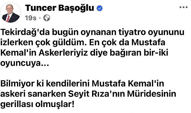 Geçtiğimiz günlerde CHP'den istifa eden Hayrabolu Belediye Başkanı Tuncer Başoğlu, sosyal medya hesabından yaptığı paylaşımda, izlediği bir tiyatro oyununa atıfta bulunarak, "Tekirdağ'da bugün oynanan tiyatro oyununu izlerken çok güldüm. En çok da 'Mustafa Kemal'in askerleriyiz' diye bağıran bir-iki oyuncuya. Bilmiyor ki, kendilerini Mustafa Kemal'in askeri sanarken Seyit Rıza'nın müridesinin gerillası olmuşlar" ifadelerini kullandı.
