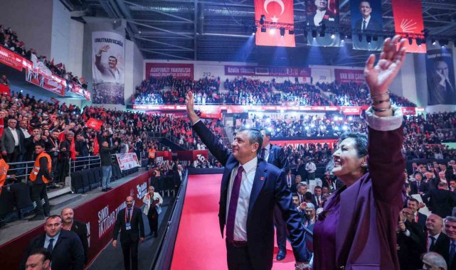 Kurultay salonuna eşi Didem Özel ile gelen CHP Genel Başkanı Özgür Özel, salonun içerisinde tam tur atarak partilileri selamladı.