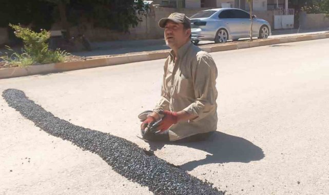 Adıyaman'ın Gölbaşı ilçesinde bedensel engelli olan mahalle muhtarı, CHP'li belediyenin yapmadığı kasisti asfalt yolda sürüklenerek yaptı.