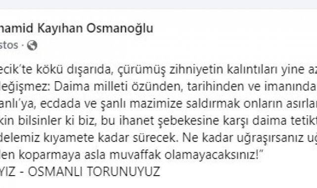 Bu tepkilerin en büyüğünü 2. Abdülhamid'in dördüncü kuşak torunu Abdülhamid Kayıhan Osmanoğlu'dan geldi. Osmanoğlu sosyal medya hesabından yaptığı açıklamada, "Ata yurdu Bilecik'te kökü dışarıda, çürümüş zihniyetin kalıntıları yine azıtmış. Bunların cibilliyeti hiç değişmez: Daima milleti özünden, tarihinden ve imanından koparmaya çalışırlar. Osmanlı'ya, ecdada ve şanlı mazimize saldırmak onların asırlardır süregelen mesleğidir. Lakin bilsinler ki biz, bu ihanet şebekesine karşı daima tetikte olacağız. Onlarla mücadelemiz kıyamete kadar sürecek. Ne kadar uğraşırsanız uğraşın, bu milleti kökünden koparmaya asla muvaffak olamayacaksınız" dedi.