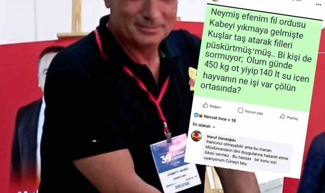 Balıkesir'in Edremit ilçesi Cumhuriyet Halk Partisi (CHP) Edremit Kadıköy Mahalle Sorumlusu Cüneyt Akgül, sosyal medyada Fil Suresi'ne yönelik alaycı paylaşımı nedeniyle görevden uzaklaştırıldı.