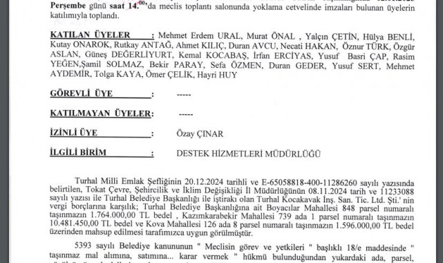 Turhal Belediye Başkanı Mehmet Erdem Ural başkanlığında, 02 Ocak 2025 tarihinde gerçekleştirilen belediye meclis toplantısında önemli bir karar alındı. Toplantıda, Turhal Belediyesi'ne ait bazı taşınmazların, Turhal Kocakavak İnşaat Sanayi ve Ticaret Ltd. Şti.'nin vergi borçlarına karşılık olarak satışına karar verildi. Toplantıya sunulan raporda, Turhal Milli Emlak Şefliği'nin 20 Aralık 2024 tarihli yazısında, Tokat Çevre Şehircilik ve İklim Değişikliği İl Müdürlüğü'nün 8 Kasım 2024 tarihli yazısına atıfta bulunarak, Turhal Belediye Başkanlığı'na ait bazı taşınmazların, belediye iştiraki olan Turhal Kocakavak İnşaat'ın vergi borçlarına mahsup edilmesi gerektiği ifade edildi. Karara göre, Boyacılar Mahallesi 848 Parsel, Kazımkarabekir Mahallesi 739 Ada 1 Parsel ve Kova Mahallesi 126 Ada 8 Parsel numaralı taşınmazlar, toplamda 13 milyon 841 bin 450 TL bedel üzerinden satışa sunulacak. Bu taşınmazların satışına yönelik karar, mecliste yapılan oylama sonucu kabul edildi. Oylamada 6 AK Parti meclis üyesi ile 2 MHP meclis üyesi ret oyu kullanırken, Turhal Belediye Başkanı Mehmet Erdem Ural başta olmak üzere CHP ve diğer MHP üyelerinin de dahil olduğu toplam 16 üyelik oy çokluğuyla karar onaylandı.