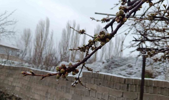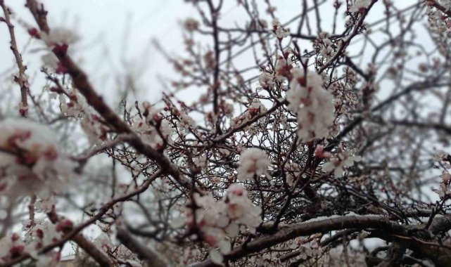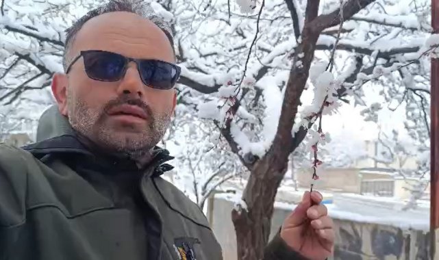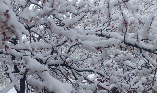 Çiçek açan ağaçlar yağan karla beyaza büründü