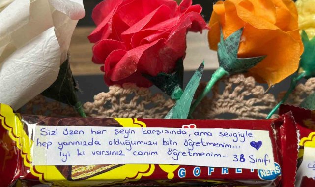 Osmaniye'nin Toprakkale ilçesinde öğrenciler, öğretmenlerine çikolata ve çiçekler üzerine yazdıkları küçük notlarla sürpriz hazırladı.