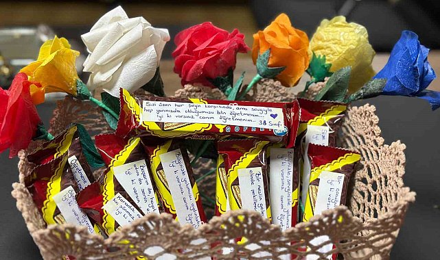 Çikolata ve çiçeklere yazdıkları notlarla öğretmenlerine sürpriz yaptılar