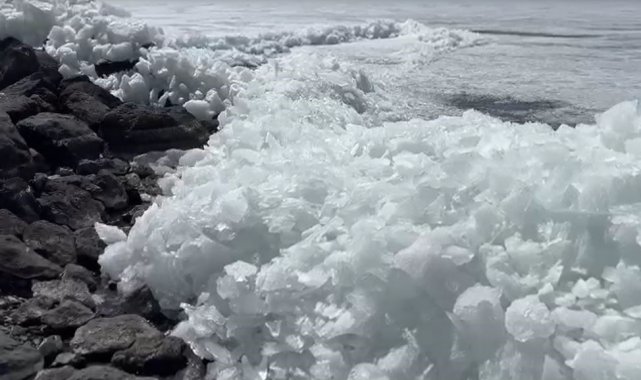 Doğu Anadolu Bölgesi'nin en büyük ikinci gölü olan Çıldır Gölü'nün kış aylarında yaklaşık 50 santimetreye ulaşan buzları havaların ısınması ve rüzgarın etkisiyle çözülmeye başladı.