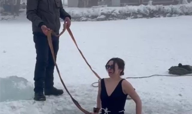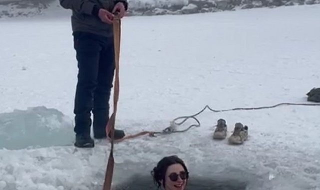 Her gün yüzlerce turistin ziyaret ettiği Çıldır Gölü, ilginç görüntülere sahne oluyor. Bir kadın Çıldır Gölü'nde buzlu suya girerek yaklaşık 30 saniye suyun içerisinde kaldı. O anlar soysal medyada viral oldu.
