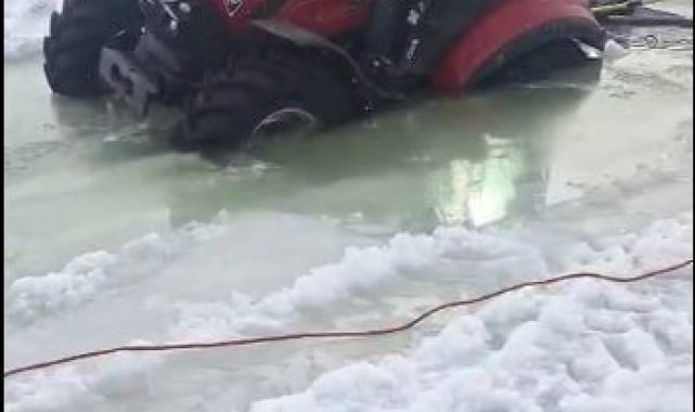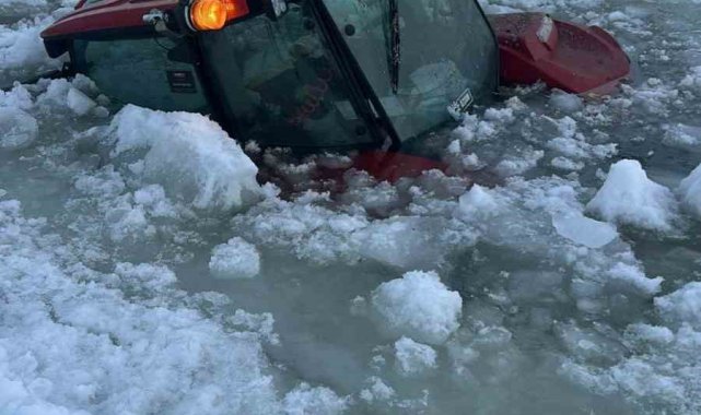 Ardahan'ın Çıldır ilçesindeki yüzeyi buz tutan Çıldır Gölü üzerinde kar temizleme çalışması yapan traktör, buzun kırılması sonucu suya gömüldü, sürücü son anda kurtarıldı.