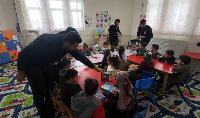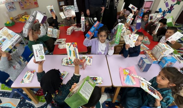 Hediyelerini alan minik öğrencilerin mutluluğu gözlerinden okunurken, dernek üyeleri çocuklarla yakından ilgilenerek oyun setlerini tanıttı.