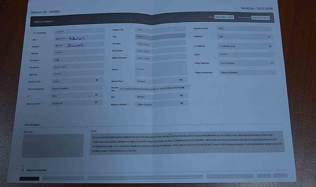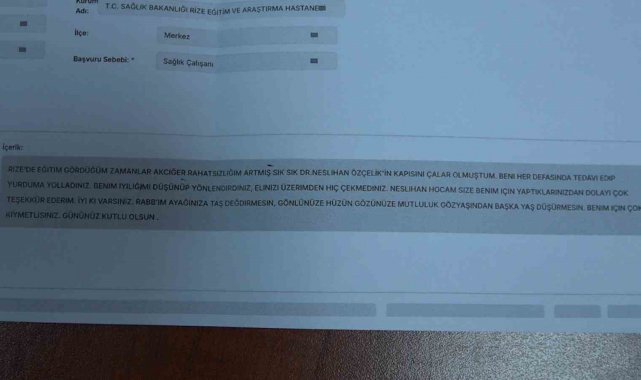 Rize'de öğrenim gördüğü sırada rahatsızlanarak akciğer yetmezliği olduğunu öğrenen 21 yaşındaki genç kız, tedavi sürecinde kendisiyle ilgilenen doktoruna minnettarlığını daha çok şikayet ve talepler için kullanılan CİMER üzerinden teşekkür mesajı yazarak iletti.