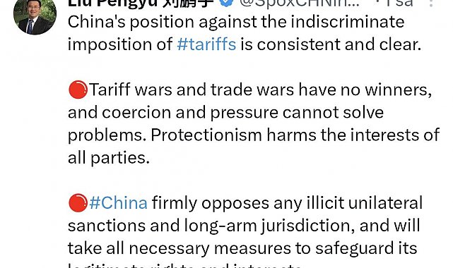 ABD Başkanı Donald Trump'ın İran ile iş yapan ülkelerin ABD ile gerçekleştirdiği her türlü ticari faaliyette yüzde 25 gümrük vergisi ödeyeceği yönündeki açıklamasına Çin'den tepki geldi. Çin'in ABD Büyükelçiliği Sözcüsü Liu Pengyu sosyal medya platformu X üzerinden yaptığı açıklamada, ülkesinin gümrük vergileri konusundaki tutumunun ayrım gözetmeksizin tutarlı ve net olduğunu vurgulayarak, "Gümrük vergisi savaşlarının ve ticaret savaşlarının kazananı yoktur, zorlama ve baskı sorunları çözemez. Korumacılık tüm tarafların çıkarlarına zarar verir" dedi.