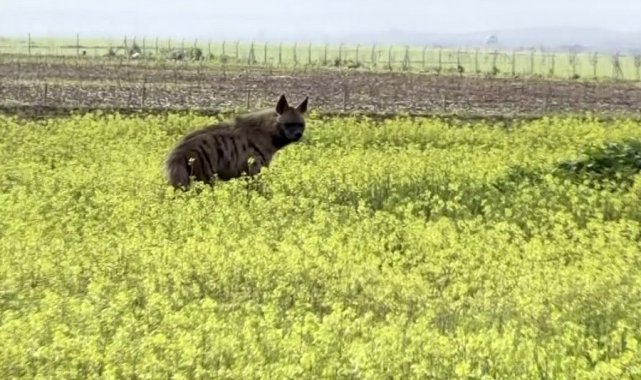 Adıyaman'ın Besni ilçesinde çizgili sırtlan sarı çiçeklerle kaplı tarlada yürürken görüntülendi.