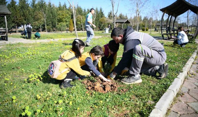 Park ve Bahçeler Müdürlüğü ekiplerinin kendilerine öğrettiği şekilde fidanları saksılarından çıkaran öğrenciler, ağaç dikmenin mutluluğunu yaşadı.