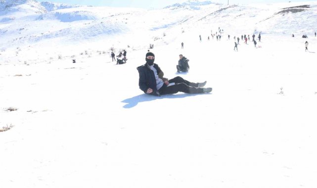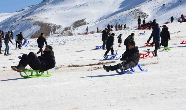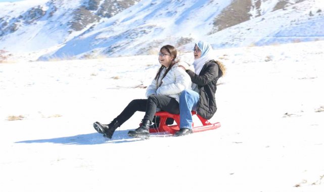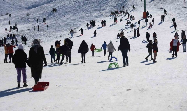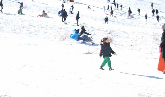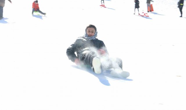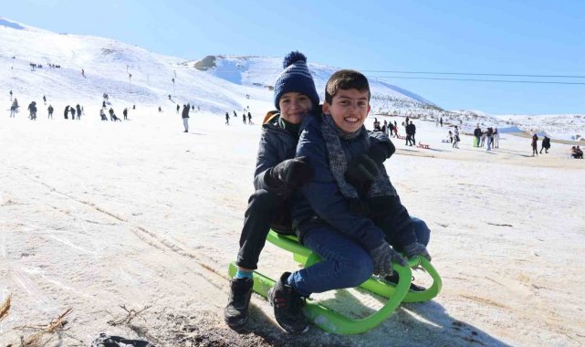 Elazığ'ın Sivrice ilçesinde göl manzarasıyla dikkati çeken Hazarbaba Kayak Merkezi'nde çocuklar sömestir tatilinin son gününde karın keyfini çıkardı.