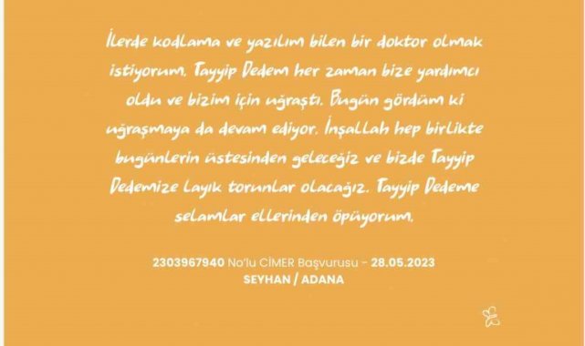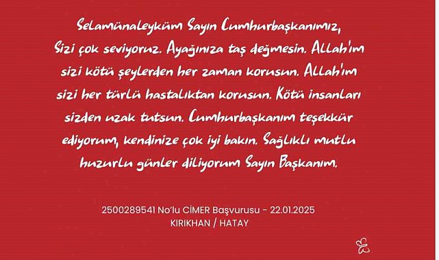 23 Nisan Ulusal Egemenlik ve Çocuk Bayramı'nı kutlayan çocuklar, Türkiye hayaline ilişkin mesajlarını CİMER üzerinden paylaştı. Çoğu Cumhurbaşkanı Recep Tayyip Erdoğan'a yazılan ve 'Cumhur Dede' hitabıyla başlayan mesajlarında çocuklar taleplerde bulunurken, teşekkürlerini iletip, önerilerini de sundular. 23 Nisan hediyesini isteyen, kar yağışı sonrası okulların tatil olmasını talep eden, soy ağacını, kan grubunu öğrenmek isteyen, kreş dahil okumaya hangi yıl başladığını soran, mahallesinde yapılan park için memnuniyetini dile getiren çocuklar CİMER'e yazdılar.
