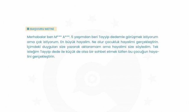 CİMER'e yapılan başvurularda bazı çocuklar 'Doğumuma kim yardım etti öğrenmek istiyorum', 'Ailemde şehit ya da madalya alan biri var mı?' gibi sorular yöneltirken, bazı çocuklar ise somut proje önerilerini paylaştı. Bir çocuk, ambulans ve itfaiye araçlarının trafik ışıklarını otomatik olarak kontrol edebileceği bir sistem önerisinde bulunurken, bir diğeri deniz akıntılarından enerji üretimine yönelik fikirlerini sıraladı. Bir başka çocuk yaz aylarında yaşanan boğulma vakalarına karşı nehir kenarlarında güvenli yüzme alanları oluşturulmasını isterken, okullarda bölgesel sorunlara yönelik proje çalışmaları yapılması önerisi de getirildi. 'Sizin gibi polis olmak istiyorum' diyerek hayalini paylaşan çocukların yanında, tedavi sürecinde kendisine destek olan sağlık çalışanlarına teşekkür mesajını ileten, öğretmenlerine teşekkür mesajları yazan çocukların da olduğu belirtildi.
