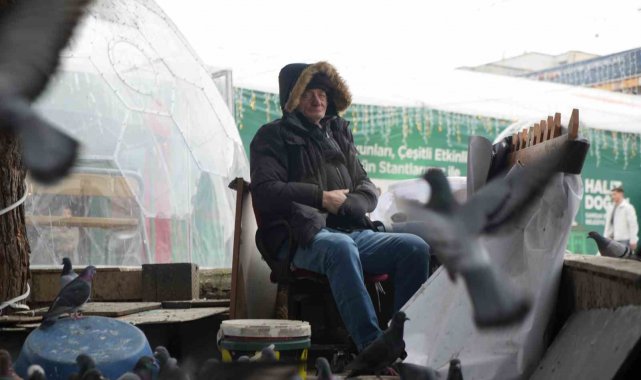 Cumhuriyet Meydanı'nda güvercinlerle birlikte adeta bir bütün haline gelen Kemal Parlak, hem kuşların aç kalmamasını sağlıyor hem de çocukların yüzünü güldürüyor.