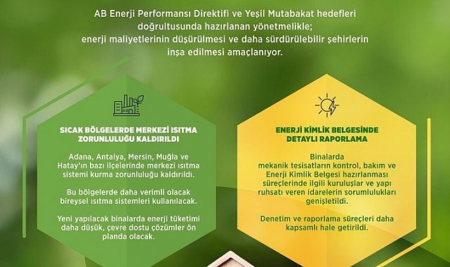 Binalarda mekanik tesisatların kontrol, bakım ve enerji kimlik belgesi hazırlanması süreçlerinde yetki ve sorumluluklar yeniden düzenlendiği belirtilen açıklamada, Denetim ve raporlama süreçleri daha kapsamlı hale getirildi. Ayrıca, enerji kimlik belgesi düzenleyen kuruluşlar ve yapı ruhsatı veren idarelerin sorumlulukları genişletildi. Yeni yönetmelik ile birlikte Türkiye, sürdürülebilir ve iklim dostu yapılaşma yolunda önemli bir adım daha atmış oldu" açıklamasında bulunuldu.