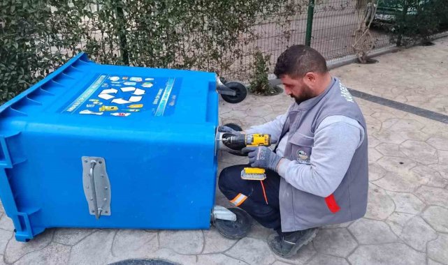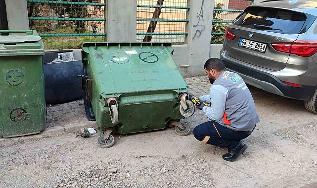 Körfez'de ekipler, ilçede kırık durumda olan ve zamanla deforme olan çöp konteynırlarını yerinde tamir ediyor.