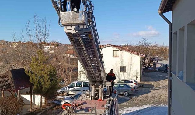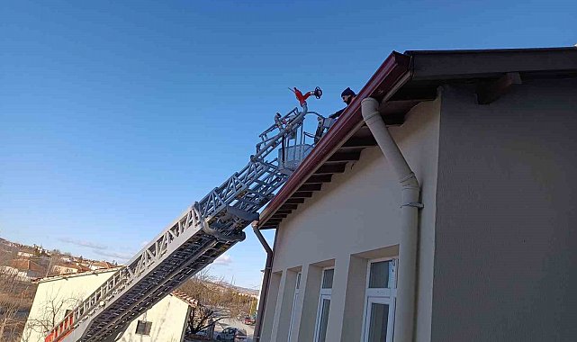 Çorum'da binanın çatısında mahsur kalan kediyi itfaiye ekibi kurtardı