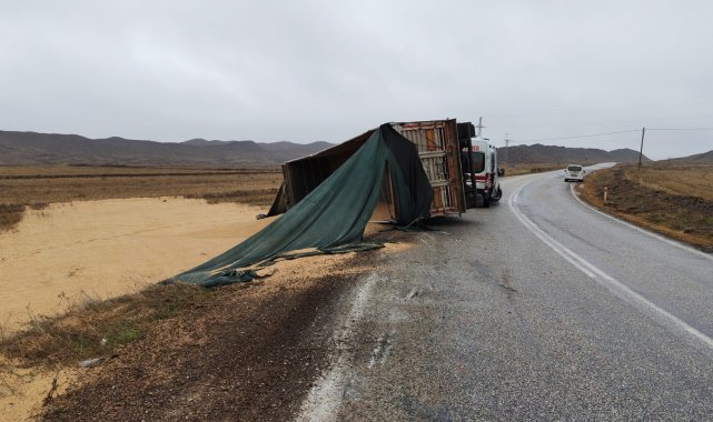 Çorum'un Sungurlu ilçesinde virajı alamayarak devrilen tırın sürücüsü yaralandı.