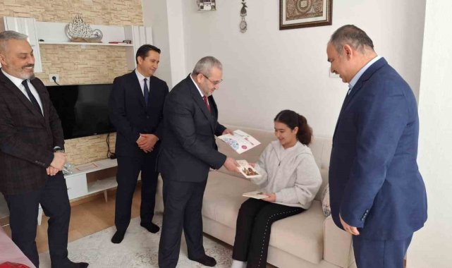 Çorum İl Milli Eğitim Müdürü Cemil Çağlar, evde eğitim hizmetinden yararlanan 7. sınıf öğrencisi Tuğsem'i evinde ziyaret ederek karne sevincine ortak oldu.