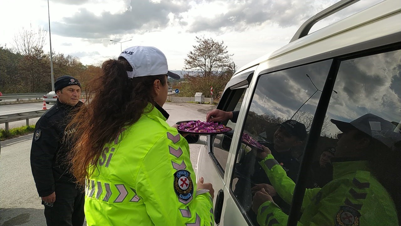 Çorum İl Emniyet Müdürü Arif Pehlivan, Bölge Trafik Şube Müdürlüğü'ne bağlı ekiplerle uygulama noktalarında şehirlerarası yük ve yolcu taşıyan ticari araçlara yönelik kış lastiği denetimi yaptı. Kış aylarında kaygan zeminlerde kaza oranını düşürmek için hayata geçirilen kış lastiği uygulaması bugünden itibaren başladı. Uygulama noktasında sürücülere kış lastiği takmaları konusunda ikazda bulunan Emniyet Müdürü Pehlivan, "Buradan tüm sürücülere göstermek amacıyla bir uygulama başlatmış bulunmaktayız. Malumunuz 1 Aralık itibariyle kış lastiği uygulamasına geçildi. Bu amaçla uygulama yapıyoruz bütün sürücülerimize hayırlı yolculuklar diliyorum kış lastiği hayat kurtarır" dedi. Denetimlerde ticari araçlar ile ağır vasıta araçların kış lastikleri kontrol edilerek derinlikleri ölçüldü. Yapılan denetimlerde araç sürücülerine, kış lastiği hakkında bilgiler veririlerken, polis ekipleri tarafından çikolata ve kolonya ikram edildi. Kış lastiği takma zorunluluğu bugünden itibaren başladığı, kış lastiği takmadığı tespit edilen araç sürücülerine 2 bin 568 TL idari para cezası uygulanacak. Çorum Emniyet Müdürlüğü tarafından yapılan açıklamada " Çorum Valilimizin kararıyla, il sınırlarımız içerisinde yaşanabilecek olumsuz hava şartlarının ulaşımı asgari seviyede etkileyerek kış mevsimi süresince trafik güvenliliğin sağlanması, vatandaşlarımızın huzur ve güven içerisinde seyahat edebilmeleri, can ve mal güvenliliğin korunması ve trafik akışının kesintisiz olarak sürdürülebilmesi amacıyla ülkemizde tescil edilmiş olsun veya olmasın şehir içi yolcu eşya taşımalarında kullanılan araçlarda da 1 Aralık 2023 - 1 Nisan 2024 tarihleri arasında kamyon, kamyonet, çekici, tanker, ticari araç, servis araçları, halk otobüsleri, İl- İlçe minibüsleri kış lastiği kullanımı zorunla hale getirilmiştir. Kış lastiği kullanma zorunluluğuna uymayan işletenler hakkında 2918 sayılı Karayolları Trafik Kanunu'nun 65/A maddesi hükmü doğrultusunda 2 bin 568 TL idari para cezası uygulanacaktır. Mevzuatımızda hususi otomobil sürücüler için kış lastiği zorunluluğu olmamasına rağmen özellikle hava sıcaklığının +7 derecenin altında düştüğü iklim şartlarında yol tutuşunun artırılarak daha güvenli yolculuklar yapabilmeleri için onların da araçlarında kış lastiği kullanmalarını tavsiye ediyoruz" ifadelerine yer verdi.