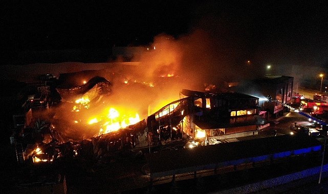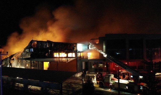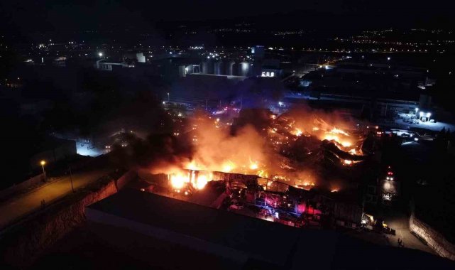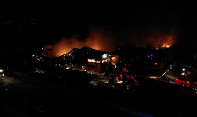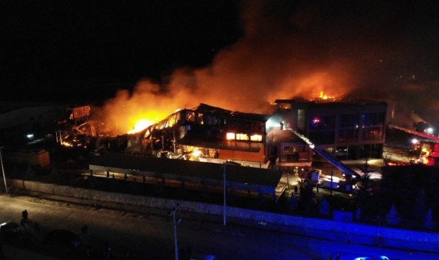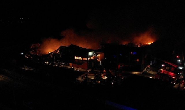 Ara ara patlamaların gerçekleştiği fabrikadaki yangının söndürülmesi için ekipler çalışmalarını sürdürüyor. Fabrikayı saran alevler ise havadan görüntülendi.