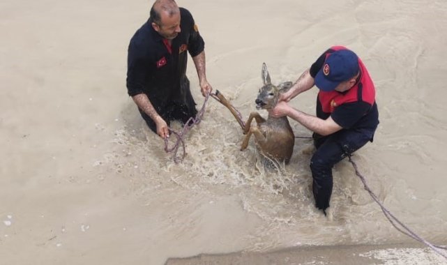 Çorum'un Bayat ilçesinde sulama kanalına düşen yavru geyik itfaiye ekip...