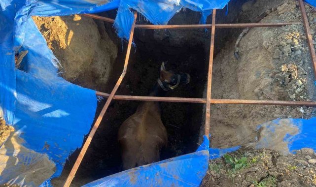 Çukura düşen büyükbaşı itfaiye kurtardı