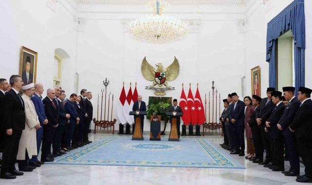 Cumhurbaşkanı Recep Tayyip Erdoğan, Malezya ziyaretinin ardından geldiği Endonezya'ya temaslarını sürdürüyor. Cumhurbaşkanı Erdoğan, Endonezya ve Türkiye arasında çeşitli alanlarda anlaşmaların imzalanması töreninin ardından Endonezya Devlet Başkanı Prabowo Subianto ile ortak basın toplantısı düzenledi. Konuşmasına Endonezya'yı G-20 Liderler Zirvesi vesilesiyle 2022'de ziyaret ettiğini ifade ederek başlayan Cumhurbaşkanı Erdoğan, "Bugün de Yüksek Düzeyli İşbirliği Konseyi Birinci Toplantısı vesilesiyle buradayız. Bu sene diplomatik ilişkilerimizin tesisinin 75. yıl dönümünü idrak ediyoruz. Ancak Endonezya ile tarihi ve beşeri bağlarımız 400 yıl öncesine kadar uzanıyor. Bu güçlü yakınlıktan ilham alan ilişkilerimizi 2011 yılında ilan ettiğimiz stratejik ortaklığımız ile taçlandırdık. Bugünkü konsey toplantımızda münasebetlerimizi daha da kurumsallaştırmış olduk" ifadelerini kullandı.