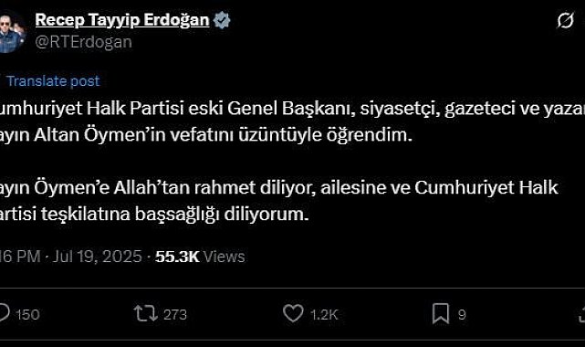Cumhurbaşkanı Recep Tayyip Erdoğan, eski CHP Genel Başkanı Altan Öymen'in ölümünün ardından resmi X hesabından taziye mesajı yayımladı. Cumhurbaşkanı Erdoğan mesajında, "Cumhuriyet Halk Partisi eski Genel Başkanı, siyasetçi, gazeteci ve yazar Sayın Altan Öymen'in vefatını üzüntüyle öğrendim. Sayın Öymen'e Allah'tan rahmet diliyor, ailesine ve Cumhuriyet Halk Partisi teşkilatına başsağlığı diliyorum" ifadelerine yer verdi.