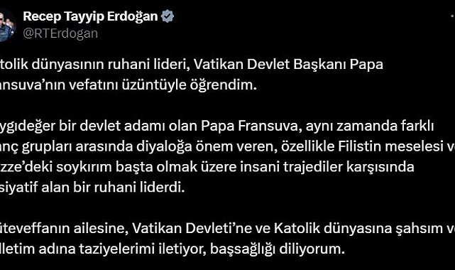 "Katolik dünyasının ruhani lideri, Vatikan Devlet Başkanı Papa Fransuva'nın vefatını üzüntüyle öğrendim. Saygıdeğer bir devlet adamı olan Papa Fransuva, aynı zamanda farklı inanç grupları arasında diyaloğa önem veren, özellikle Filistin meselesi ve Gazze'deki soykırım başta olmak üzere insani trajediler karşısında inisiyatif alan bir ruhani liderdi. Müteveffanın ailesine, Vatikan Devleti'ne ve Katolik dünyasına şahsım ve milletim adına taziyelerimi iletiyor, başsağlığı diliyorum."