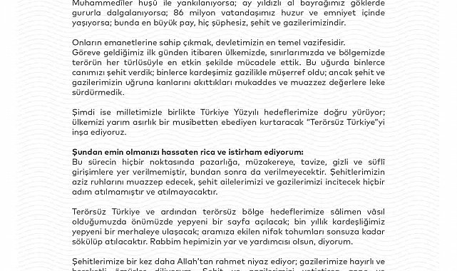 "Sizi ve ailenizin her bir ferdini en kalbî duygularımla selamlıyorum. Peygamberlikten sonraki en şerefli makama erişen aziz şehitlerimizi rahmetle, gazilerimizi şükranla yâd ediyorum. Şühedâ yurdu bu toprakların her karışı, şehit ve gazilerimizin kanlarıyla yoğrulmuştur. Bugün semalarımızda Ezân-ı Muhammedîler huşû ile yankılanıyorsa; ay yıldızlı al bayrağımız göklerde gururla dalgalanıyorsa; 86 milyon vatandaşımız huzur ve emniyet içinde yaşıyorsa; bunda en büyük pay, hiç şüphesiz, şehit ve gazilerimizindir. Onların emanetlerine sahip çıkmak, devletimizin en temel vazifesidir. Göreve geldiğimiz ilk günden itibaren ülkemizde, sınırlarımızda ve bölgemizde terörün her türlüsüyle en etkin şekilde mücadele ettik. Bu uğurda binlerce canımızı şehit verdik; binlerce kardeşimiz gazilikle müşerref oldu; ancak şehit ve gazilerimizin uğruna kanlarını akıttıkları mukaddes ve muazzez değerlere leke sürdürmedik. Şimdi ise milletimizle birlikte Türkiye Yüzyılı hedeflerimize doğru yürüyor; ülkemizi yarım asırlık bir musibetten ebediyen kurtaracak Terörsüz Türkiye'yi inşa ediyoruz. Şundan emin olmanızı hassaten rica ve istirham ediyorum: Bu sürecin hiçbir noktasında pazarlığa, müzakereye, tavize, gizli ve süflî girişimlere yer verilmemiştir, bundan sonra da verilmeyecektir. Şehitlerimizin aziz ruhlarını muazzep edecek, şehit ailelerimizi ve gazilerimizi incitecek hiçbir adım atılmamıştır ve atılmayacaktır. Terörsüz Türkiye ve ardından terörsüz bölge hedeflerimize sâlimen vâsıl olduğumuzda önümüzde yepyeni bir sayfa açılacak; bin yıllık kardeşliğimiz yepyeni bir merhaleye ulaşacak; aramıza ekilen nifak tohumları sonsuza kadar sökülüp atılacaktır. Rabbim hepimizin yar ve yardımcısı olsun, diyorum. Şehitlerimize bir kez daha Allah'tan rahmet niyaz ediyor; gazilerimize hayırlı ve bereketli ömürler diliyorum. Şehit ve gazilerimizi yetiştiren anne ve babalarımızın o mübarek ellerinden; şehitlerimizin emaneti olan sevgili evlatlarımızın gözlerinden öpüyorum. Sizleri sevgiyle, saygıyla selamlıyorum."
